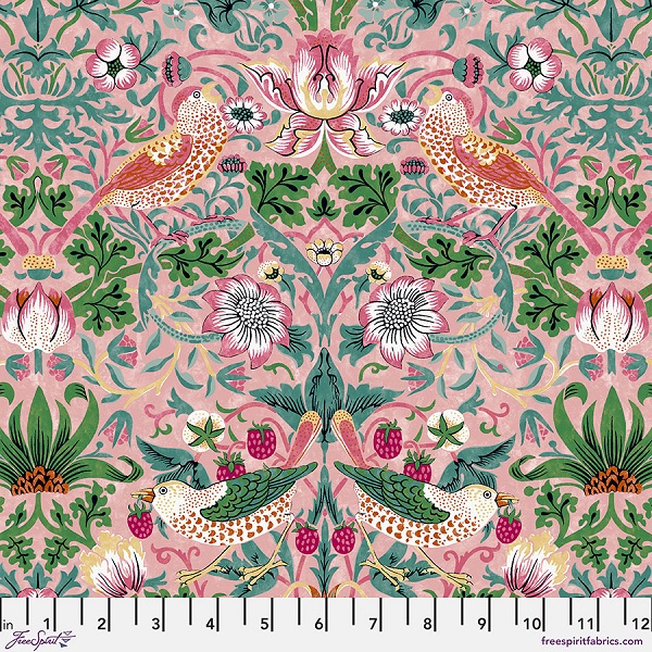 PWWM001.Blush Strawberry Thief, Bedford Park by Morris & Co.  features cheeky birds perched on bowing branches pecking at invitingly plump strawberries.