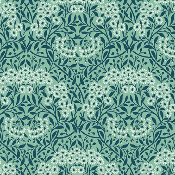 Michaelmas Daisy Buttermere, PWWM035.MINT. Originally designed by J.H. Dearle in 1912 this fabric depicts pretty daisies arranged within delicate branches giving a trellis effect.