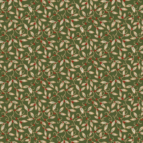PWWM095.GREEN The Cotswold Holiday Collection, Mistletoe Green, Morris & Co. Intertwining mistletoe, with red berries, on a green background.