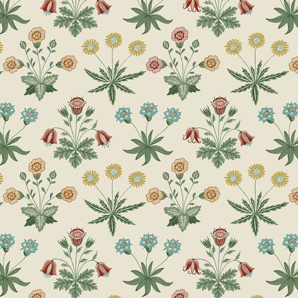 PWWM100 Emery Walker Collection, Daisy Multi, Morris & Co. – blue, pink and yellow flowers and daisies, on a cream background.