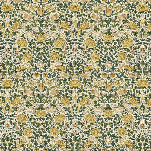 PWWM104 Emery Walker Collection, Small Rose Weld, Morris & Co. – delightful small yellow roses, with green leaves, on a cream background.