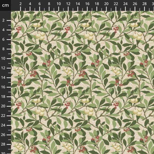 PWWM117.BAY Arbutus, Suffolk Holiday Collection by Morris & Co. features a beautiful pattern of leaves and berries on a soft beige background. A beautiful fabric ideal for any craft projects, quilting, patchwork and home decor.