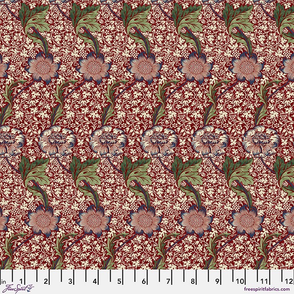 PWWM129.Berry Kennet, The Oxford Holiday Collection by Morris & Co. is a design of rows of flowers and leaves on a red background.