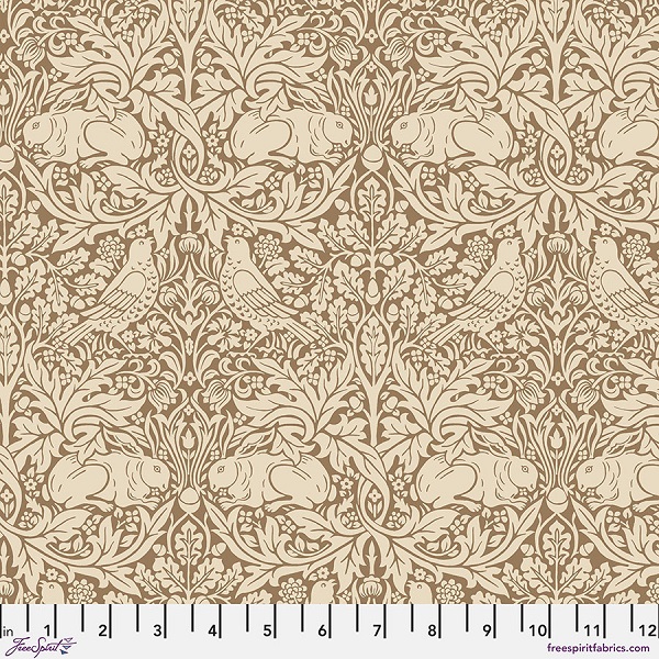 PWWM131.Gold MED Brer Rabbit, The Oxford Holiday Collection by Morris & Co. is a design of cream rabbits and birds on a brown background.