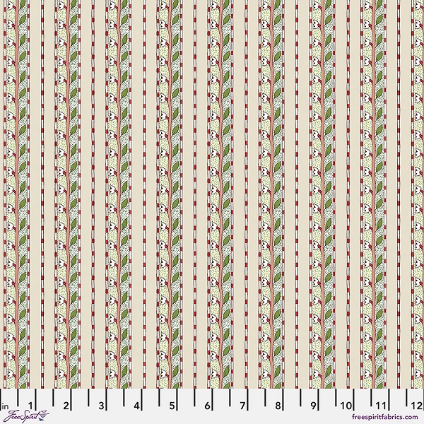 PWWM141.Ivory Daffodil Stripe, Bedford Park by Morris & Co. is a design of stripes of white daffodils and red stripes on a cream background.
