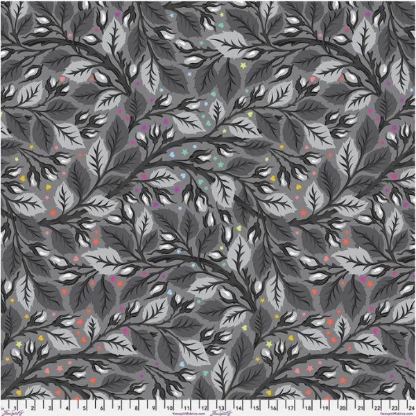 QBTP020.Shadow Nip in the Bud 108″ Extra Wide Backing, Graywork by Tula Pink features grey branches and leaves with multi coloured hearts and stars.