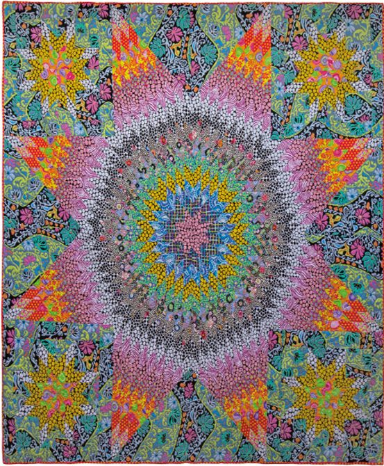 Bali Brocade makes a fantastic background to Kaffe’s sumptuous Shimmer Star quilt with its ripples of pattern in contrasting prints.