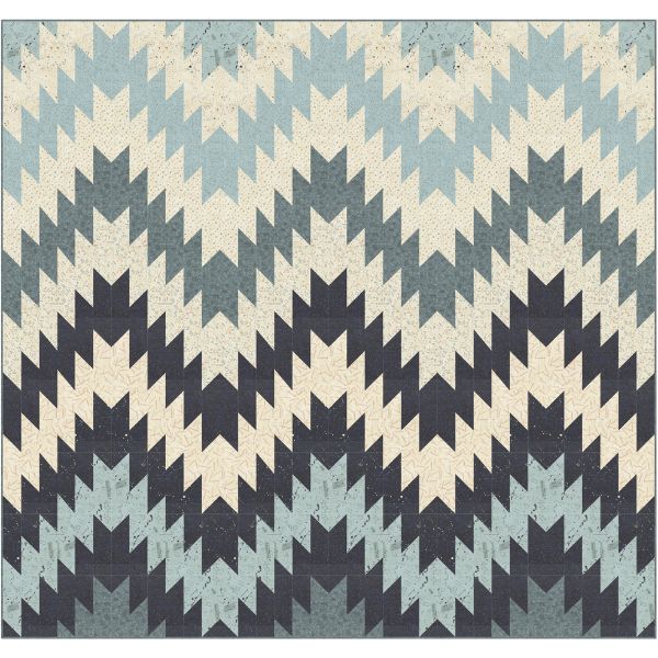Rhythm Quilt Kit 85 x 90in, Data by Janet Clare features a charming geometric design of blues and creams creating a lightning-look effect. The quilt kit includes all fabrics for the quilt top, binding, and the pattern. The finished quilt top measures approximately 85″ x 90″.