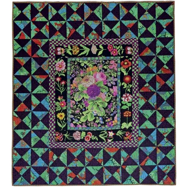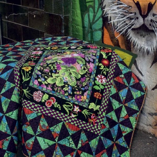 Medallion quilts can range from the super simple to the extremely complicated. This one has a simple but very effective centre panel in Philip Jacobs’ beautiful Gradi Floral print surrounded by concentric border prints. The double border of striking black and green hourglass blocks sets the design off perfectly.