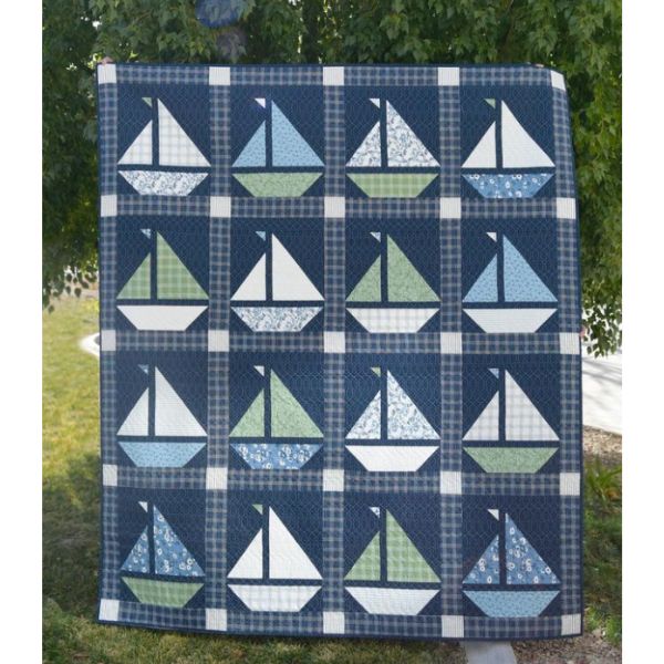 Sail Quilt Kit, Nantucket Summer by Camille Roskelley includes all fabrics for the quilt top and binding, plus the pattern. This quilt is a fun design of sail boats on a navy background.