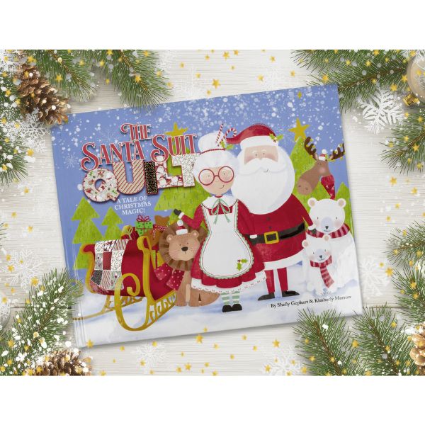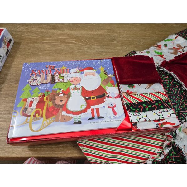 Santa Suit Quilt Kit Box. Create a gift to least for generations. Straight from the North Pole sewing room, each Santa Suit Quilt Kit includes a beautifully illustrated hardcover storybook, 90 festive fabric squares, and beginner-friendly instructions—everything you need to stitch a keepsake quilt full of holiday magic.