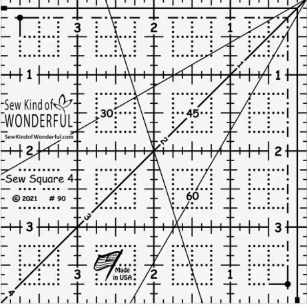 The Sew Square 4 is a 4″ square-up ruler. It makes squaring up 4inch blocks easy and has added reference marks.
