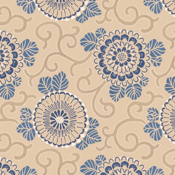 SH1 Hajime Linen, Hajime by Stuart Hillard for Lewis & Irene features blue floral circular patterns on a pale yellow background.