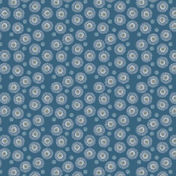 SH18 Small Floral Burst, Hajime by Stuart Hillard for Lewis & Irene is a design of small cream flowers surrounded by lines on a blue background.