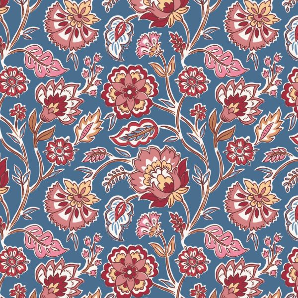 SH19C Indian Summer Large Floral Indigo & Red, Indian Summer by Stuart Hillard features large pink and red flowers on an indigo background.