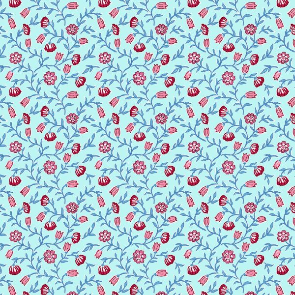 SH21C Climbing Flowers Blue, Indian Summer by Stuart Hillard features delicate red flowers on a blue background.