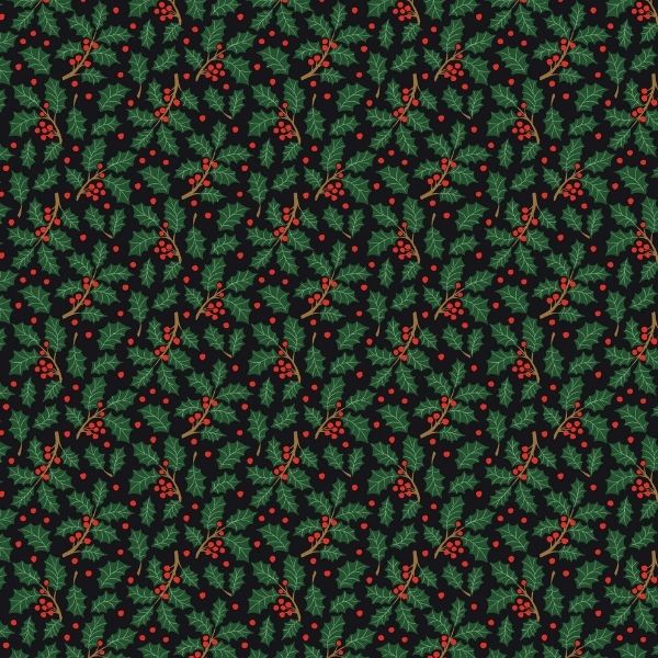 SH26C Holly on Black, All is Bright by Stuart Hillard is a design of green holly with red berries on a black background.