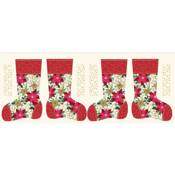 SH29 Stocking Panel, All is Bright by Stuart Hillard is a 1/2 yard panel to make up red stockings with gold and red poinsettias, holly, and mistletoe.