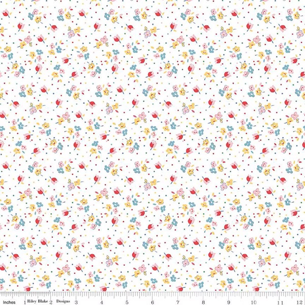 C16653 White Calico Sweet Rose by Sandy Klop of American Jane for Riley Blake Designs.  This sweet print features blossoms and polka dots on a white background. Perfect for pretty quilts, bags and dress making.