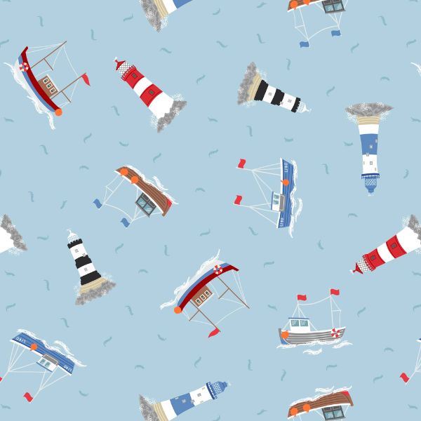 SM59.1 Boats & Lighthouses on Light Blue is a coastal inspired design featuring a repeating pattern. Small Things Coastal by Lewis & Irene is a collection featuring all things to do with the ocean.