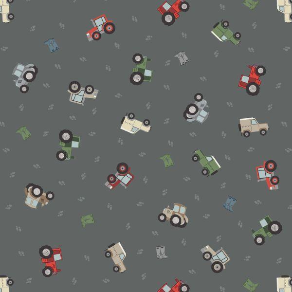 SM67.2 Farm Vehicles and Wellies Grey by Lewis and Irene, is a fun print featuring tractors in different colours, jeeps, and wellies. Perfectly placed for fussy cutting and useful in all sorts of sewing projects. Ideal for children’s quilts or playmats.