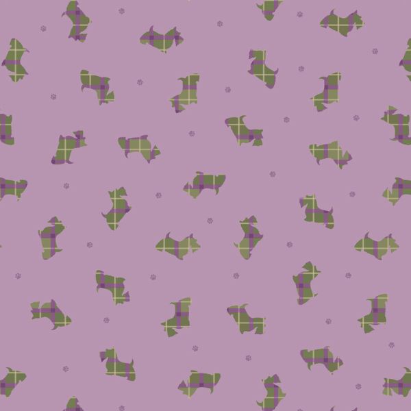 SM73-2 Small Things…Celtic Inspired, Scottie Dog on Purple, Lewis & Irene. A gorgeous design of green check scottie dogs and paw prints, featured on a purple background.