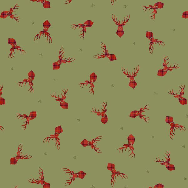SM75-2 Small Things…Celtic Inspired, Stag on Green, Lewis & Irene. A striking design of red check stags and tiny Trinity Knot symbols (Celtic love knots), featured on a green background.