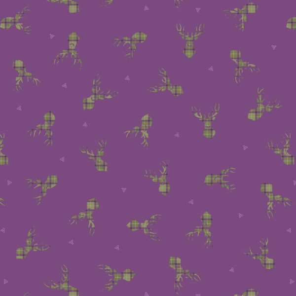 SM75-3 Small Things…Celtic Inspired, Stag on Purple, Lewis & Irene. A striking design of green check stags and tiny Trinity Knot symbols (Celtic love knots), featured on a purple background.
