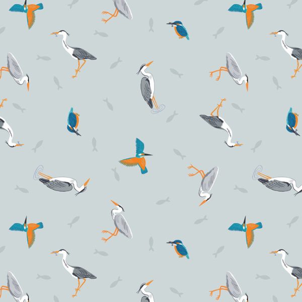 SM79.2 Herons and Kingfisher on Light Blue, Small Things…Rivers & Creeks by Lewis & Irene features herons and kingfishers on a blue background.