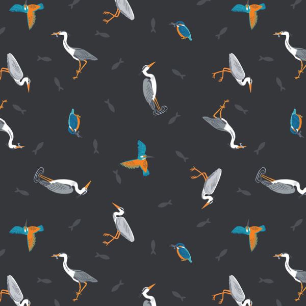 SM79.3 Herons and Kingfisher on Dark, Small Things…Rivers & Creeks by Lewis & Irene features herons and kingfishers on a black background.