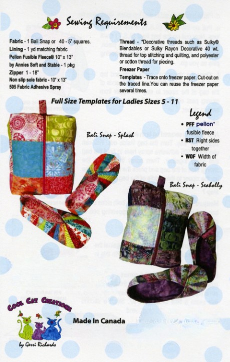 Slippers & their cute travel bag are made using 1 package of Bali Snaps or Squares. Use Slipper Gripper (#SG+colour) for the bottoms and a foam-based non-fusible interfacing, such as Soft & Stable. Full size templates included for ladies sizes u.s.a 5 – 11. Slippers have removable insoles.