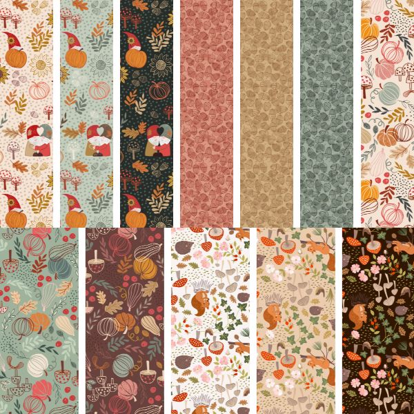 This charming autumn inspired collection showcases playful prints think acorns, mushrooms, cuddly gnomes, pumpkins, and more rendered in soothing seasonal hues of cream, sage, chocolate, and forest tones