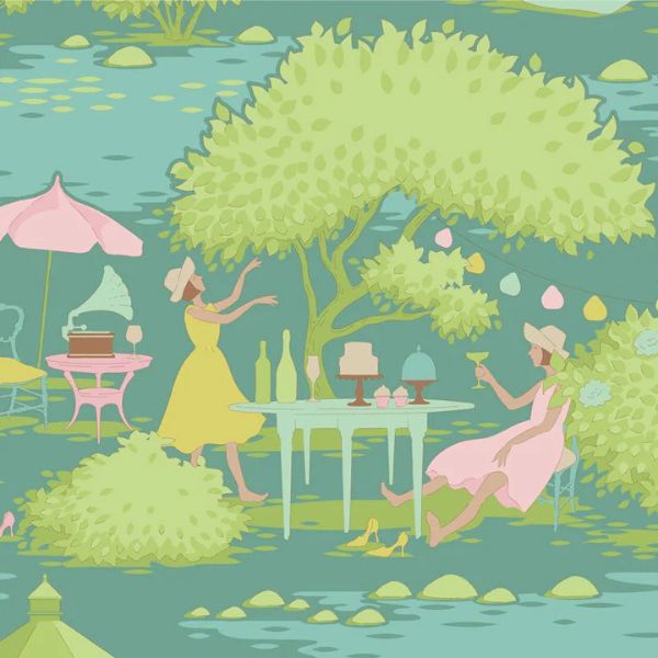 TD100585 Sunday Brunch Teal, Sunday Brunch by Tilda depicts friends sharing a lovely, laid-back brunch in the garden.