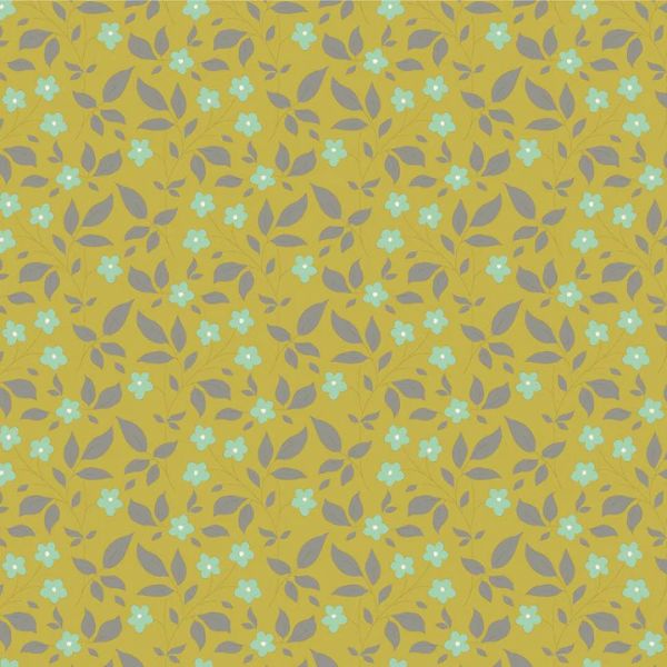 TD110119 Tipsy Sour Yellow, Sunday Brunch by Tilda is a design of blue flowers and leaves on a yellow background.