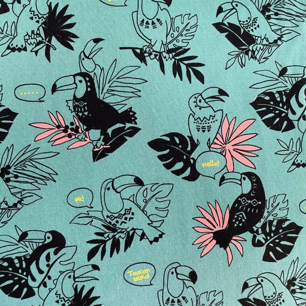 Teal Toucan Canvas is a fun print of Toucans and tropical flowers on a teal background.