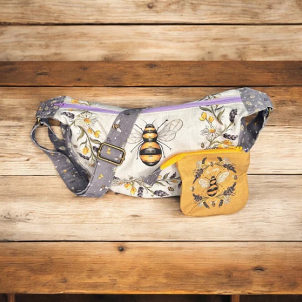 The Sling Bag Set is so useful as its curved shape allows it to sit neatly under your arm with an adjustable shoulder strap making it’s easy to carry. It’s a surprisingly roomy bag with an internal pocket too and this one features original Amber Makes illustrations of bees, busy in the lavender and daisies. It also comes with a cute matching Curvy Purse which sits neatly inside and keeps all your little items safe.