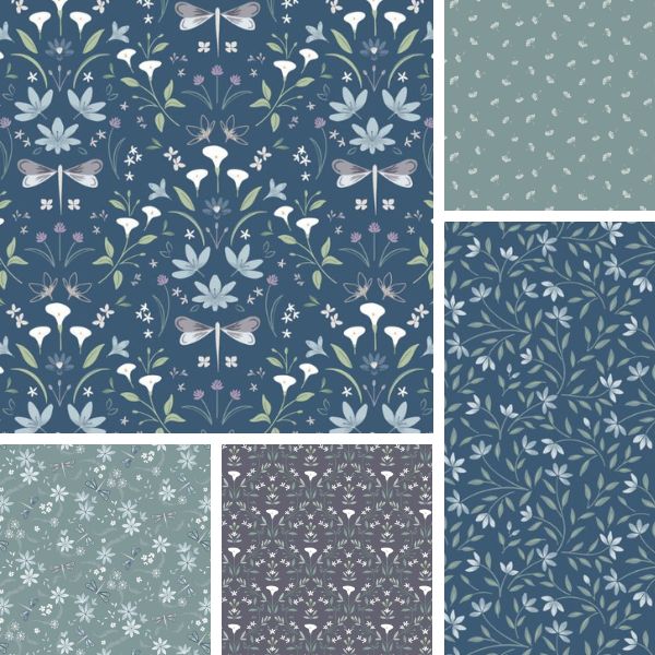 The Water Gardens Darks Fat Quarter Pack (5 pcs), Cassandra Connolly for Lewis & Irene is a collection of darker tranquil and delicate designs.