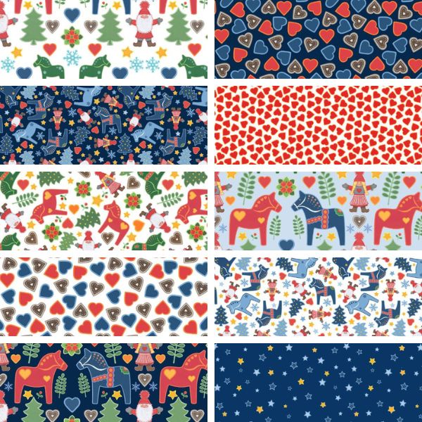 Tomten’s Folklore Christmas Fat Quarter Pack by Lewis & Irene contains all 10 designs from the Tomten’s Folklore Christmas collection by Eva Melhuish.