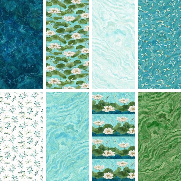 Tranquil Waters Fat Quarter Pack (8pcs) by Deborah Edwards is a serene collection of water textures, lily pads and dragonflies.