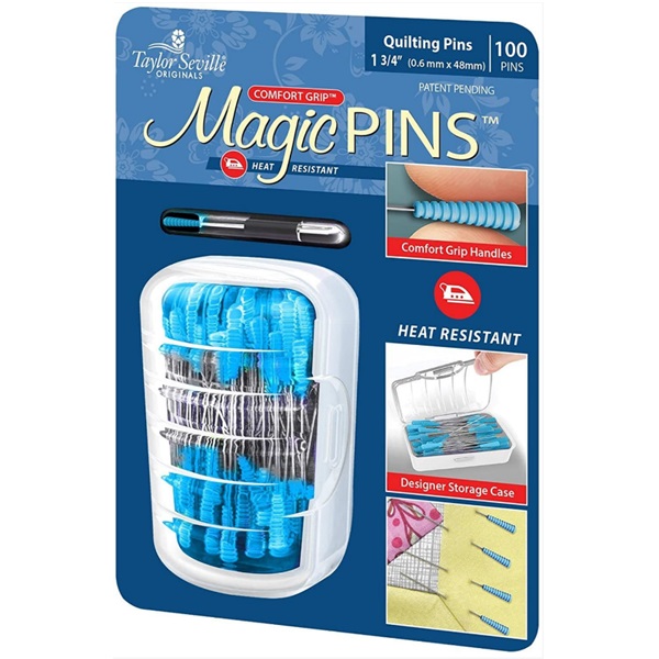 TS217139 Magic Quilting Pins. Unlike regular pins which can be difficult to find and handle, the large comfort grip handles of Taylor Seville’s Magic Pins make them easy to find, pick up and remove from your fabric so that they do not scratch the underside of your iron. The Magic pins which are heat resistant are available in a choice of pack sizes in secure snap close boxes for storage.
