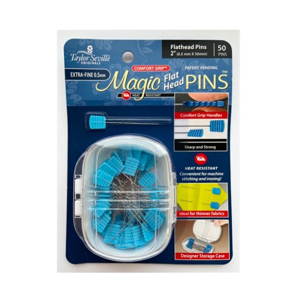 TS219942 Magic Pins Flat Head. Unlike regular pins which can be difficult to find and handle, the comfort grip handles of the Taylor Seville Magic Pins make them easy to find, pick up and remove from your fabric so that they do not scratch the underside of your iron.