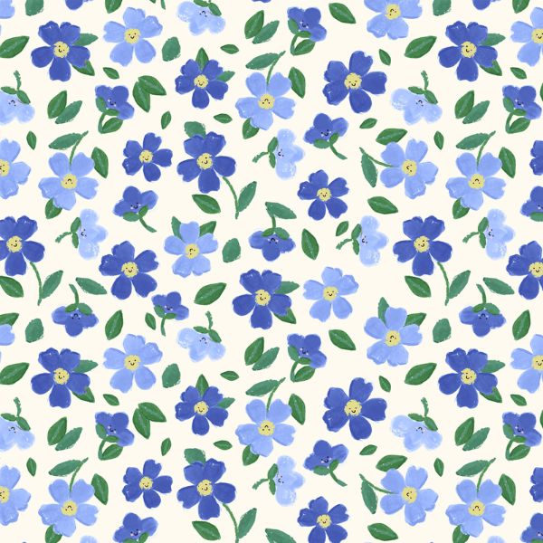 WB037 Maia Cornflower, Patchwork Collection by Wee Blue Bell is a design of blue flowers with with smiley faces and green leaves on a white background.