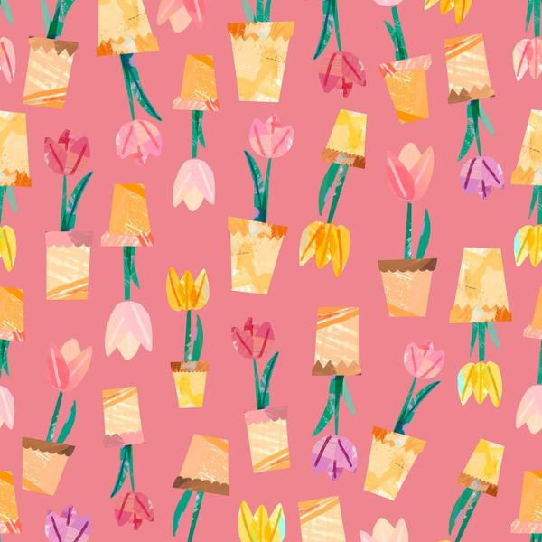 WB071 Potted Tulips Peach, Flower Market by Wee Blue Bell features potted tulips of pinks, yellow and red on a pink background.