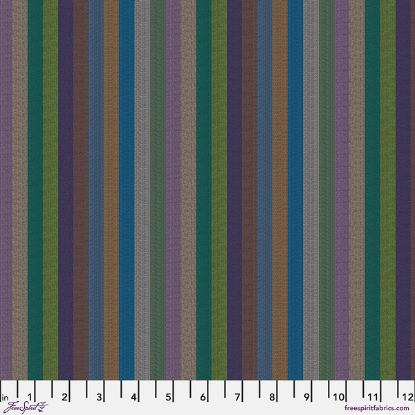 WSGP002.Multi Narrow Stripe Multi, Woven Stripes by Kaffe Fassett is comprised of narrow stripes in purple, green, blue and orange.
