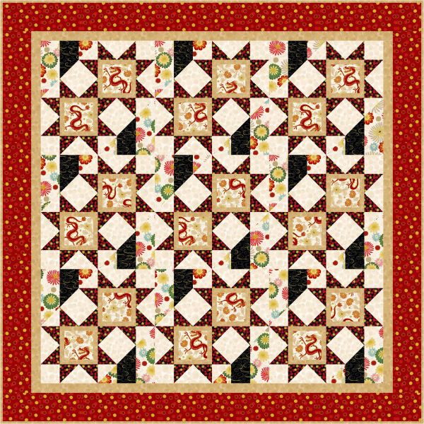 Year of the Dragon Table Topper Quilt Kit 2 features fabrics from the Year of the Dragon collection. It is a smaller geometric quilt, perfect as a table topper or lap quilt. Colours are rich reds, golds, dark jades and black, all with gold metallic highlights.